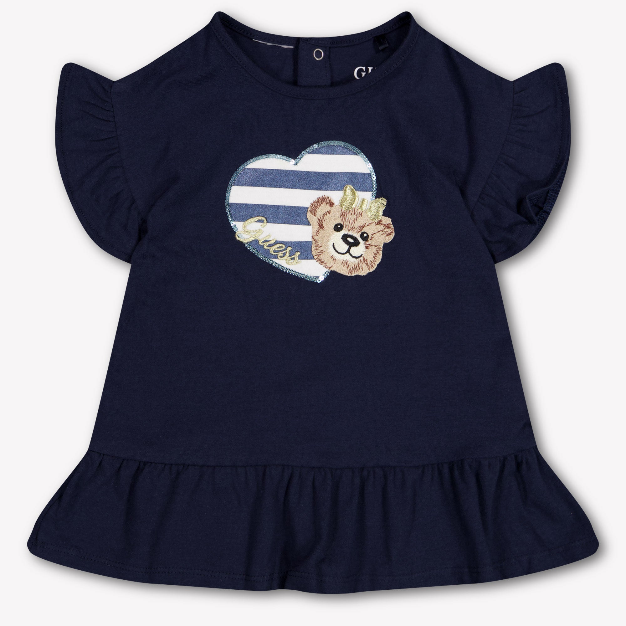 Ontdek de betovering van deze Guess Baby meisjesjurk in navy. Met zijn speelse strikdetails en charmante geborduurde beer, straalt het verfijning en schattigheid uit. De zachte stof en comfortabele pasvorm maken het ideaal voor feestelijke gelegenheden of een stijlvolle dag uit. Een must-have voor de modebewuste mini-fashionista. 🌟