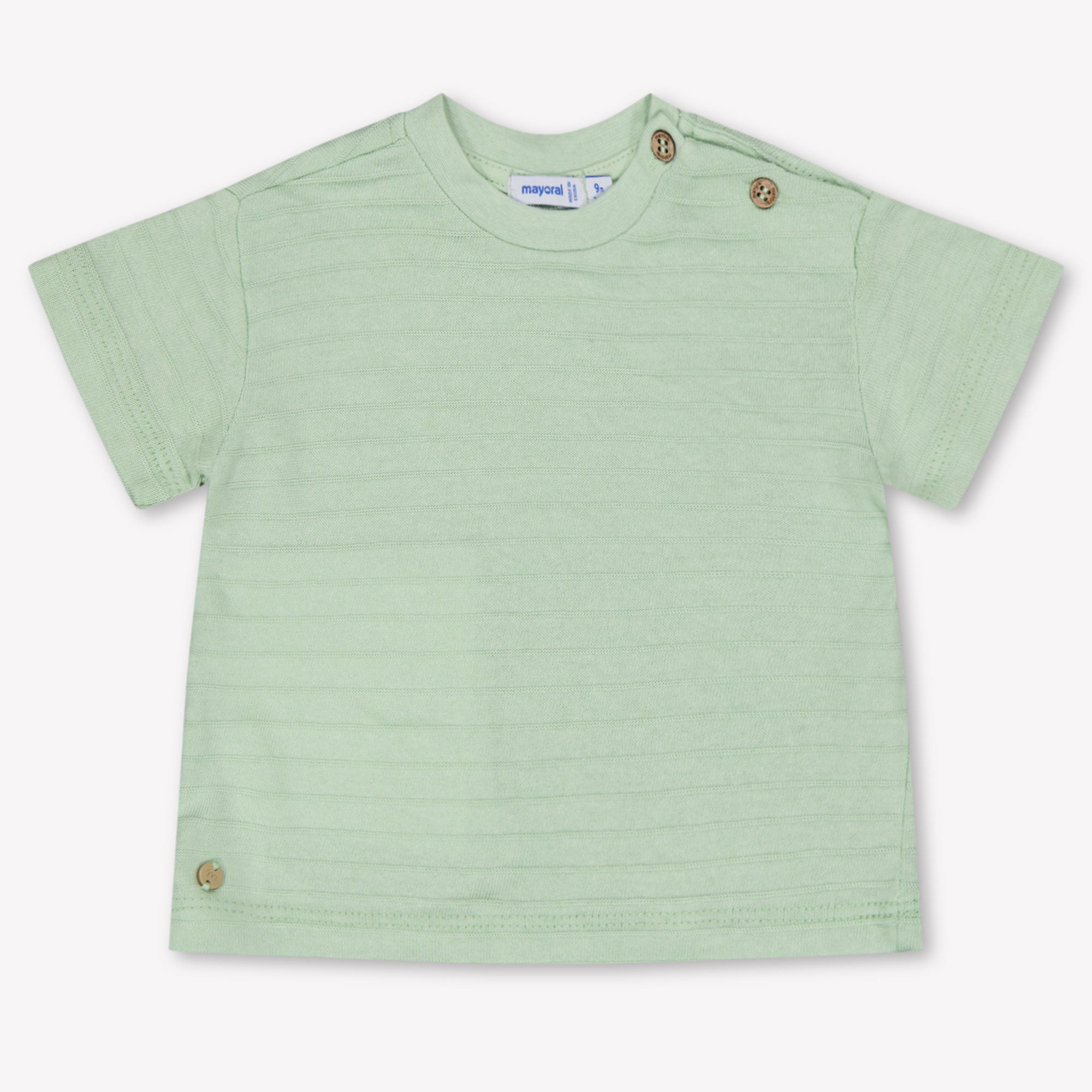 Ontdek de verfijning van eenvoud met dit lichtgroene Mayoral baby T-shirt. 🌿 Gemaakt van een zachte ribjersey die zijdezacht aanvoelt op de huid, biedt dit item ultiem comfort én stijl. De subtiele structuur in de stof en de houten knoopdetails op de schouder geven het shirt een natuurlijke, luxe uitstraling. Perfect voor zomerse dagen — moeiteloos te combineren met elke outfit van je kleintje.