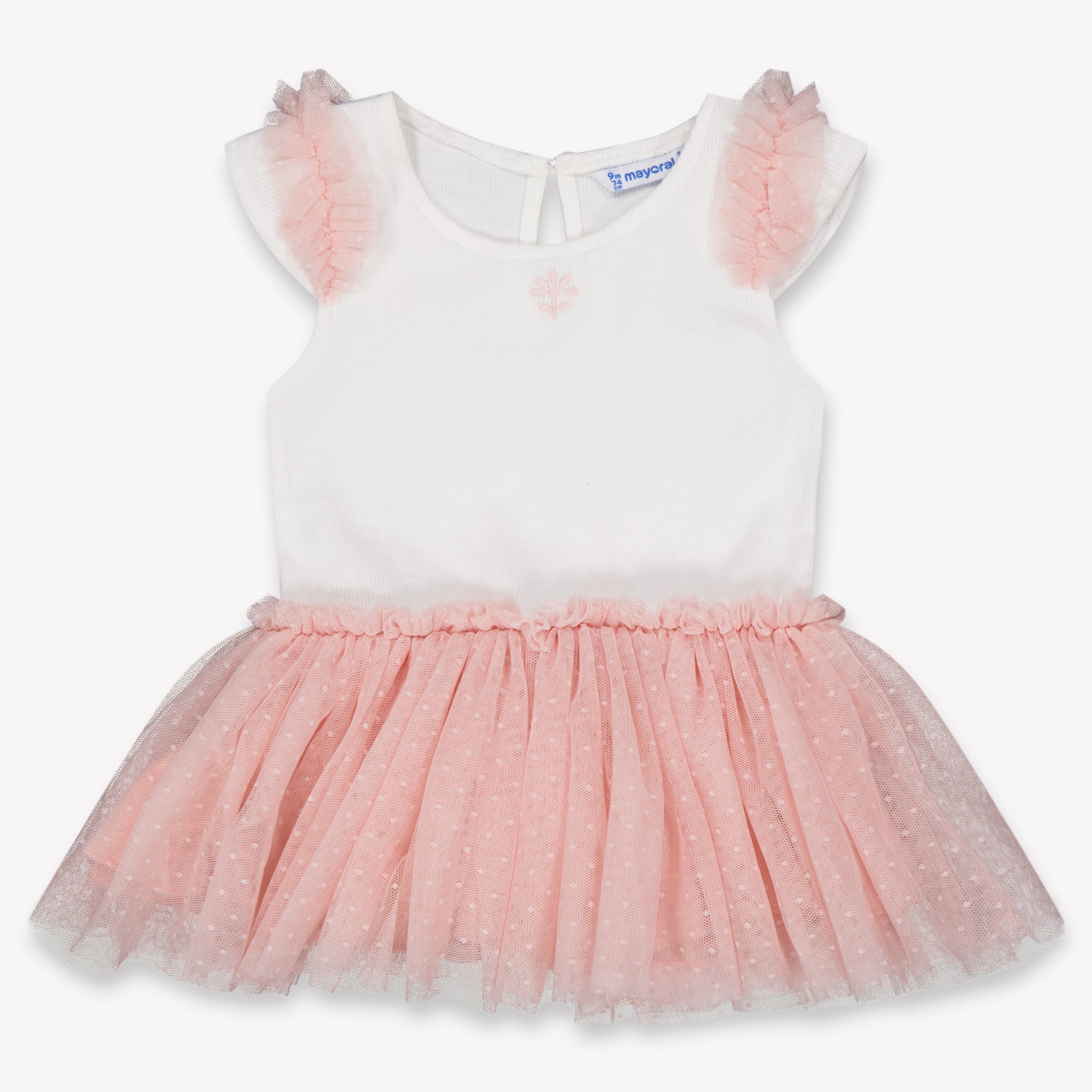 Betoverend in elk detail: deze Mayoral babyjurk in lichtroze straalt pure zachtheid en elegantie uit ✨. Het topje is gemaakt van een comfortabele, zachte stof met een subtiel geborduurd detail, terwijl de tule rok met verfijnde stipjes en luchtige plooien een dromerige touch geeft. De ruches op de schouders maken het geheel speels en charmant — perfect voor bijzondere momenten of als stijlvol cadeautje. 🌸