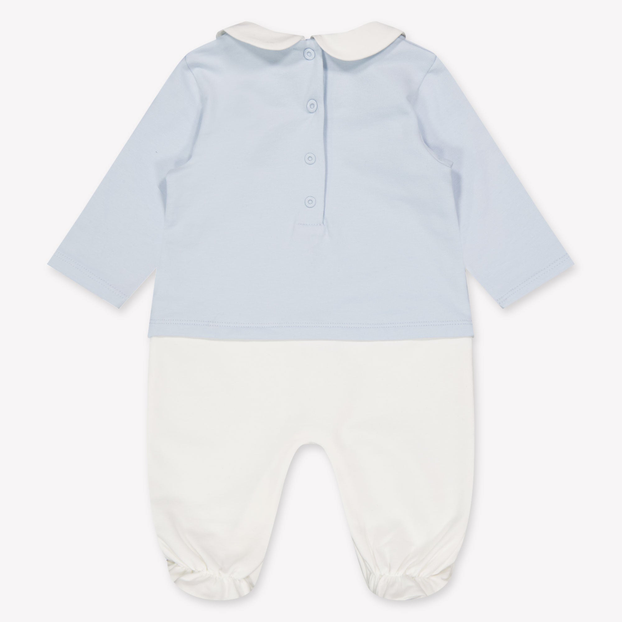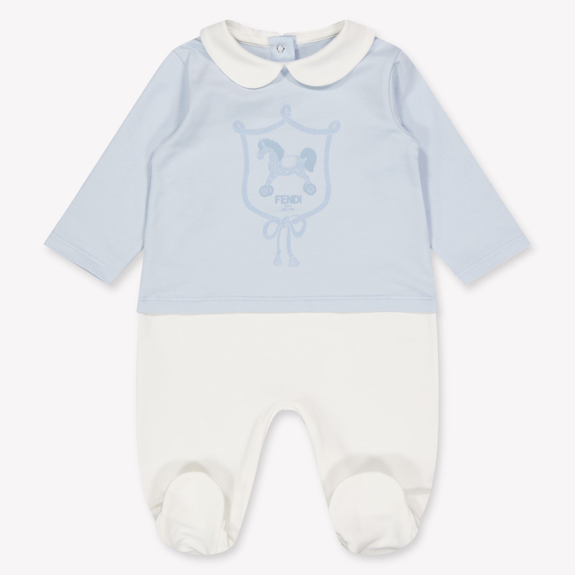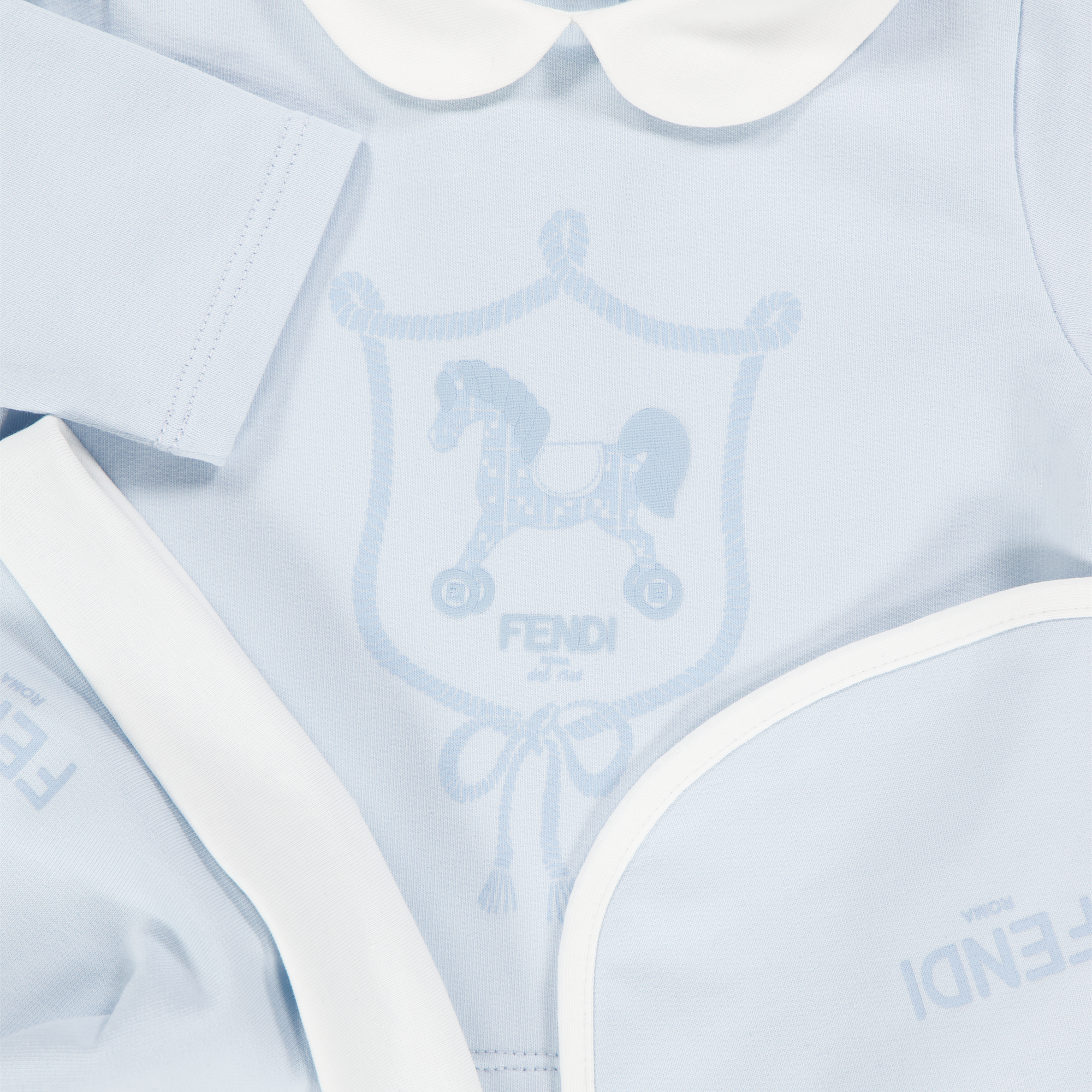 A charming first impression starts here 💙. This Fendi Baby unisex Playsuit in light blue is an ultimately refined birth gift, made from a silky soft cotton blend that feels wonderful on the sensitive baby skin. The iconic rocking horse motif and the ton-sur-ton Fendilogo bring a subtle luxury to life. Complete with matching hat and bib, this three-piece set offers comfort and class in one stylish gift box.